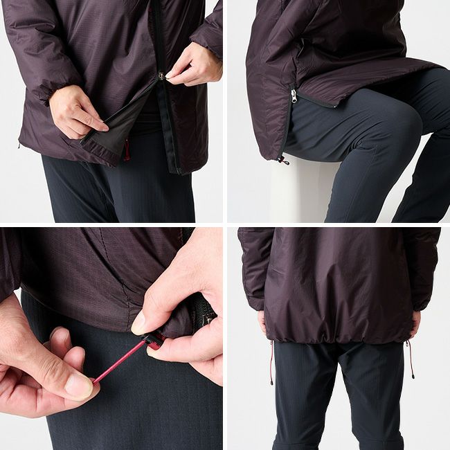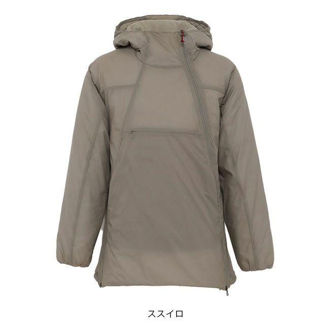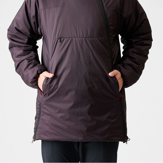 裏地に採用しているPERTEX QUATUM AIRは20dn×20dnのミニリップストップナイロンで、25.5cm³ /cm²/sという高い通気性(一般のウィンドブレーカーの約25倍)が最大の特長です。これによって発汗による水蒸気を効果的に中綿へと受け渡します。汗を掻いた状態で着用しても蒸れや濡れ残りがない環境を作り上げるためにはなくてはならない素材です。 また、撥水性にも優れているので汗を透過させてもびしょびしょに濡れることはありません。非常に軽くてソフトな風合いなので中綿の暖かさと柔らかさをより感じることができます。
