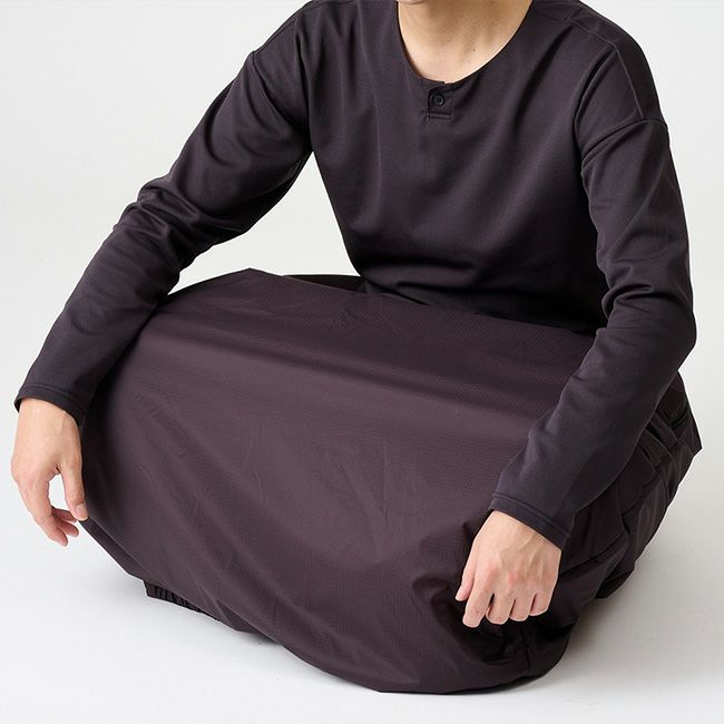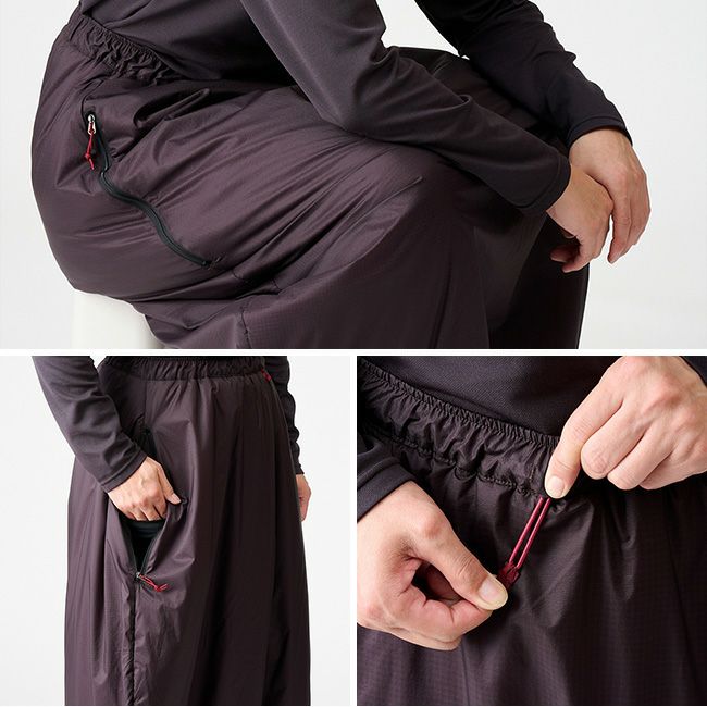 深い腰回りとスルーポケットで快適な着用感を実現し、足元を覆えば保温効果を高められます。