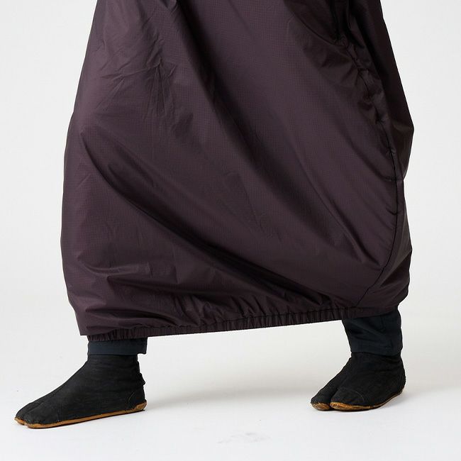 な、なにこれ?とインパクトの強い樽型のシェイプは、あぐらをかいても膝が突っ張ることなく中綿をしっかり膨らませるためのもので、日帰りシノギングの休憩やお泊りシノギングのリラックスタイムを暖かく過ごせるユニークなスカートです。座った時にずり落ちて寒くないように腰周りを深くしてあり、両脇のスルーポケットは下に穿いたパンツのポケットにアクセスできる他にハンドウォーマーとしても有効です。ダウンパンツは座って使うことが多いのに膝と腰が突っ張ってせっかくのダウンがつぶれてしまい、そこだけ寒く感じることも少なくありませんが、アグラスカートは座った状態でも立った状態でも足腰をしっかり温めます。
