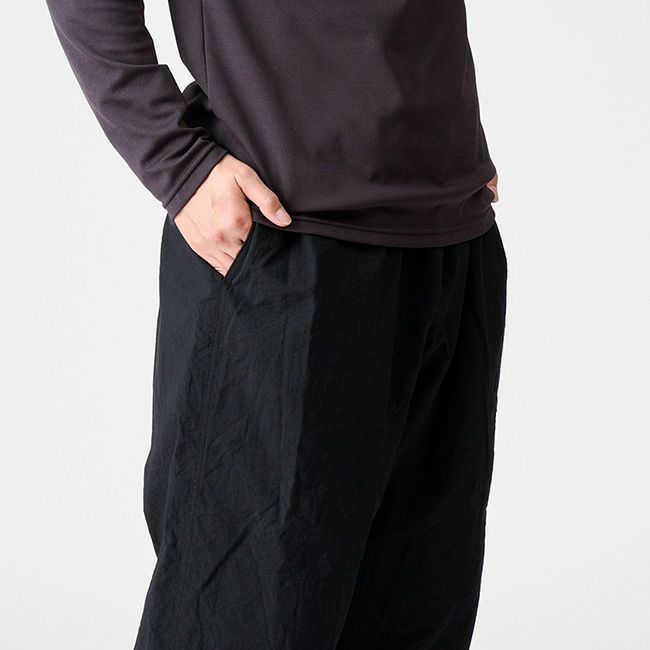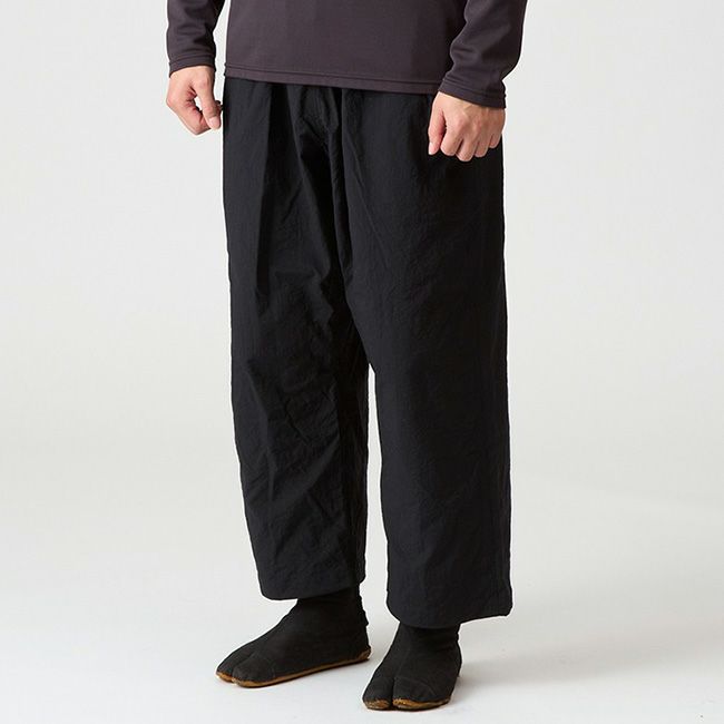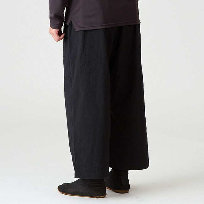 光沢がなく適度なハリコシのあるヴィンテージナイロン素材を採用したこのパンツは秋から春までのシノギングに最適です。使い勝手を考慮してウェストにストレッチドローコードを入れ、腰の両脇に前後に振り分けたポケットを設けていますが、それ以外は柔道パンツそのままの作りで、膝裏には共生地を宛てた補強が施されています。広い股のマチは膝があごに付きそうな急登の動きに難なく追従し、巾広で寸胴な作りによってワイドパンツならではのベンチレーション効果を得ることができます。