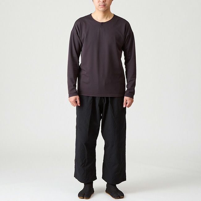太くて中途半端な丈のパンツなので、小さめのサイズでも大き目のサイズでも意外と穿くことができます。お好みのサイズで着こなしてください。裾の内側に紐を入れる穴を設けているので紐を入れて絞って穿くこともできます。足まわりにはクナイ・ショートを合わせてもいいですし、クナイにインして膝まわりをだぶだぶに余らせて穿くとまるで天狗のような出で立ちがキマります。風になびくシルエットは孤高の柔道家のようでもあり、いかにも日本らしいシルエットを作り出します。