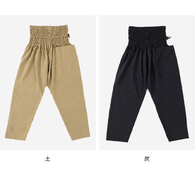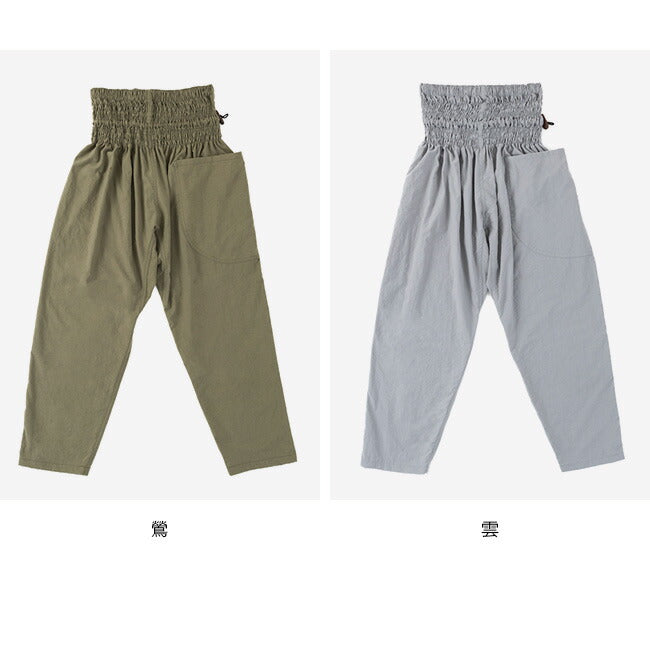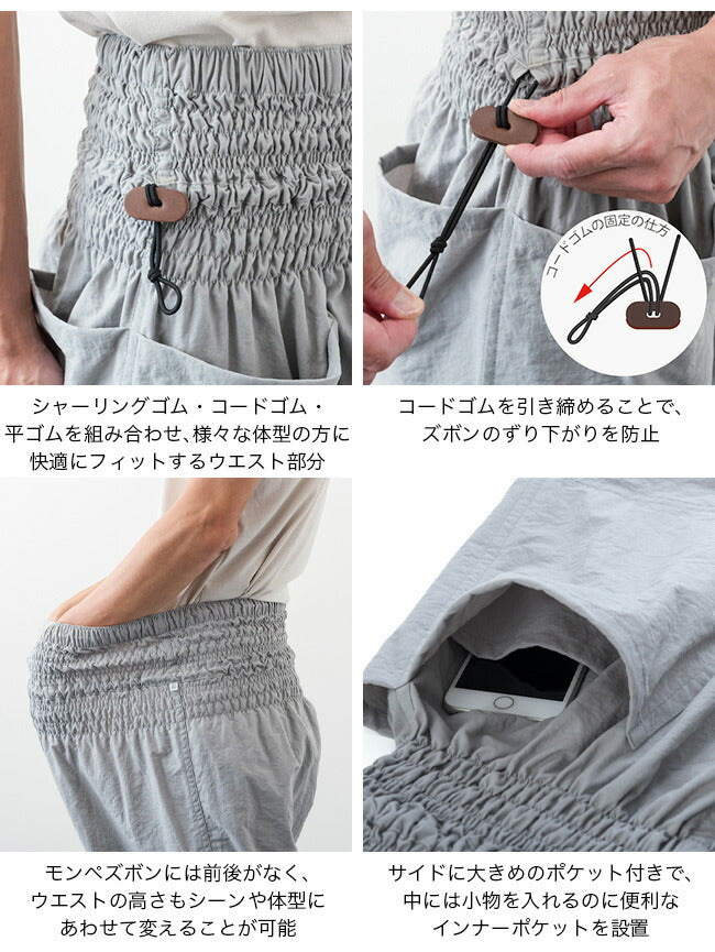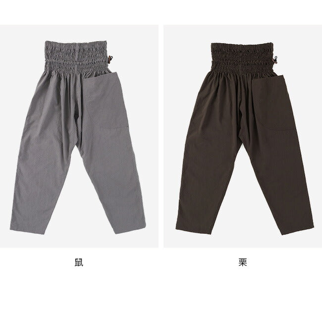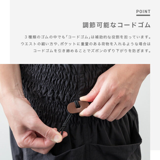 ウエストの細い方や、モンペズボンの大きなポケットに重量のある荷物を入れるような場合はコードゴムを引き締めることでズボンのずり下がりを防ぎます。