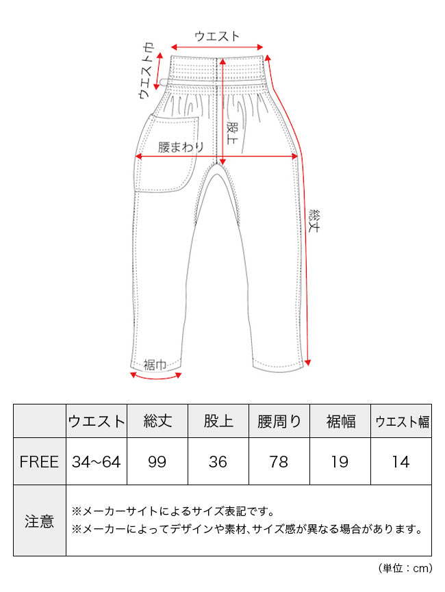 1.ウエスト:ゴム上がり 34cm、伸ばし時最大 64cm
