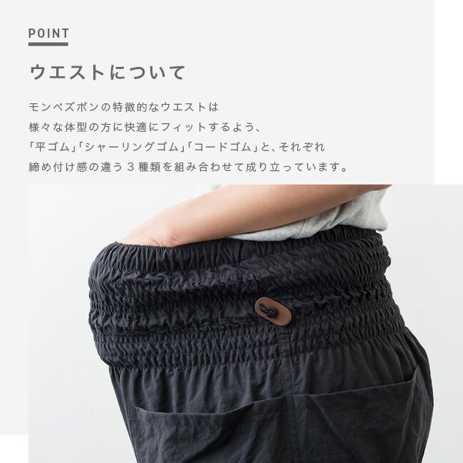モンペズボンの特徴的なウエストは「平ゴム」「シャーリングゴム」「コードゴム」とそれぞれ締め付け感の違う3種類を組み合わせて成り立っています。