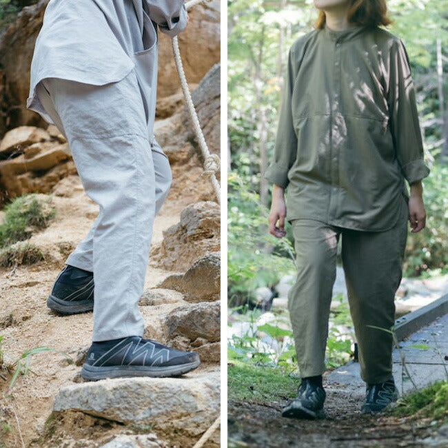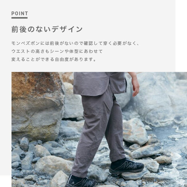 またモンペズボンは前後がないので朝起きぬけでボーッとしている時や狭いテントの中で寝袋に包まって着替えをする時などでも確認して穿く必要がなく、ウエストの高さもシーンや体型にあわせて変えることができる自由度があります。