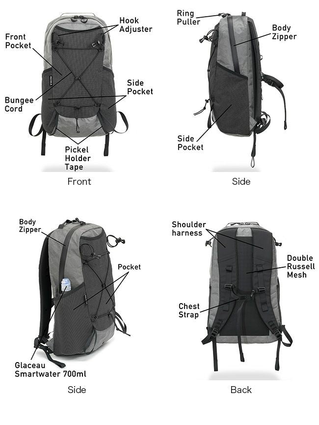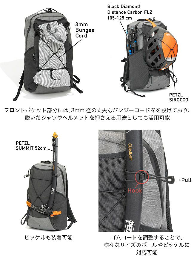 フロント、サイドポケット:ナイロン66 68%、超高分子量ポリエチレン 21%、ライクラ®ファイバー 11%(UltraStretch™)
