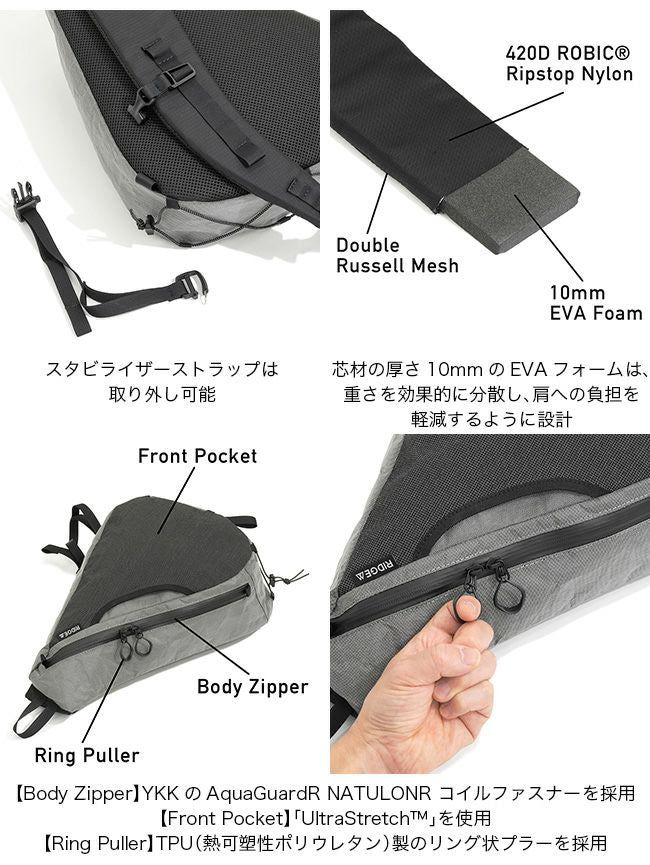 フロントポケット : ナイロン66 68%、超高分子量ポリエチレン 21%、ライクラ®ファイバー 11%(UltraStretch™)