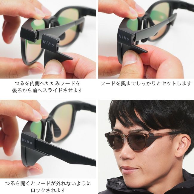 Nihoはサイドフードをワンタッチで着脱できる構造のため、山はもちろん、普段使いでも積極的に着用できるデザイン(特許構造)を実現しています。