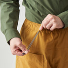 股下を少し短くして裾回りを細くすることで裾の擦れを軽減し歩きやすさを提供します。