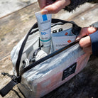 山では、ファーストエイド/常用薬から基礎化粧品、櫛、レスキューシート、電池パック、カイロ、テーピング等々、かなりの量が整理整頓された綺麗な状態で入ります。絶妙な透け感がまたよく、より何が入っているのがわかります。普段使いも同様で、散らかりがちが嫌で、大小様々なポーチ類を使用していたものが、これひとつで収まりました。
