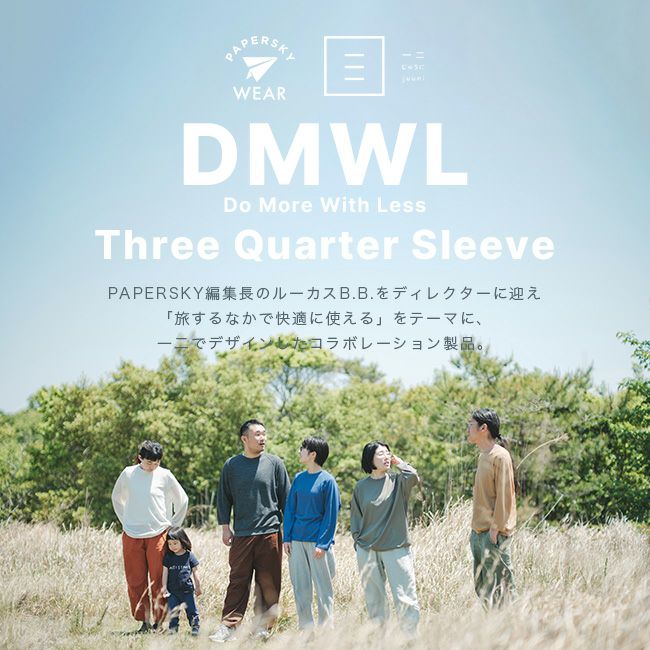 DMWL は、ルーカスB.B.(PAPERSKY編集長)をディレクターに迎え「旅するなかで快適に使える」をテーマに、一二でデザインしたコラボレーション製品。「Do More With Less」という名前の通り、最低限のデザインながら、季節を問わずさまざまな環境で使いやすいカットソーです。