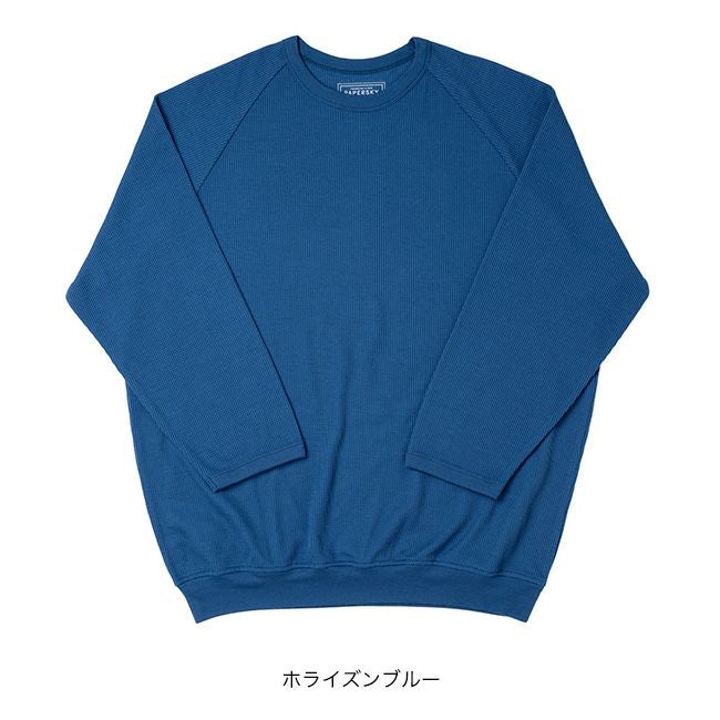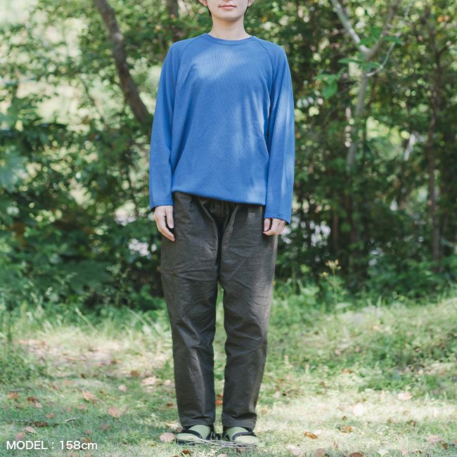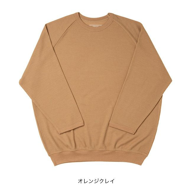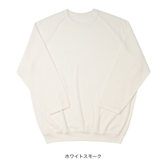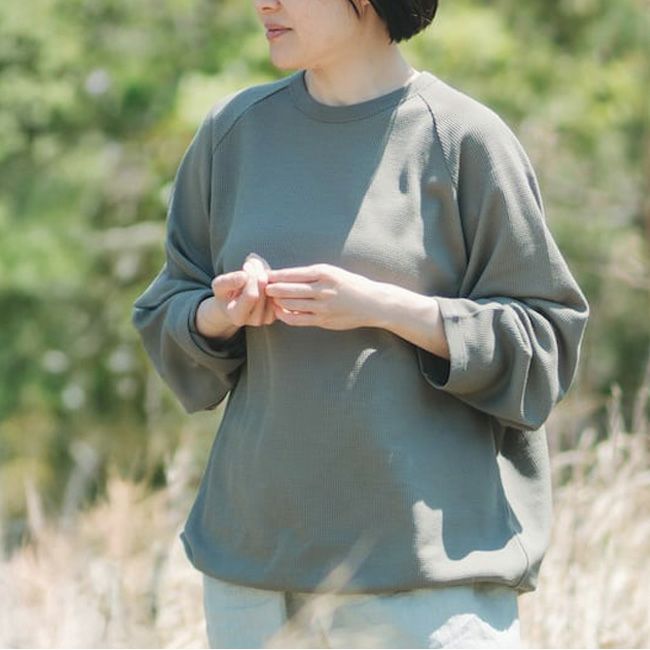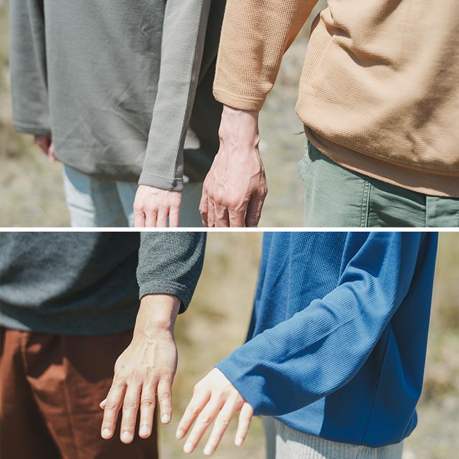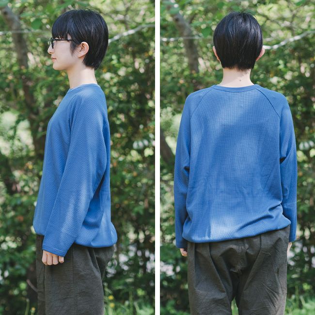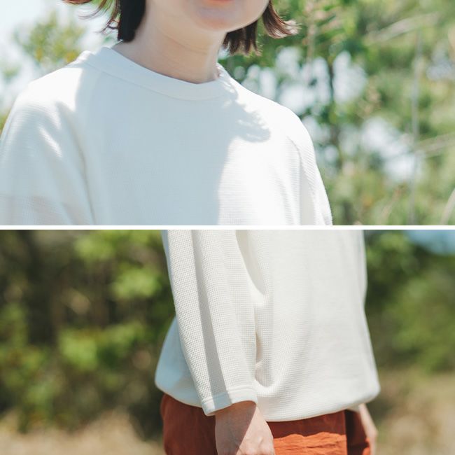 また、表面に凹凸のあるワッフル組織は、生地が直接肌にあたる面積が小さく、肌へ張り付く不快感が少ないため、暑い時期は1枚で着用すれば風が抜け、寒い時期は生地と体の間に空気の層をつくり、暖かく過ごすことができます。