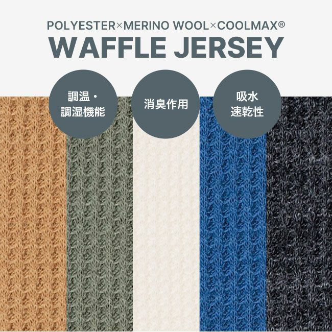 素材は軸糸にポリエステルのフィラメント糸、カバー糸にニュージーランドメリノウールとCOOLMAX®の混紡糸を使用したワッフルジャージー。