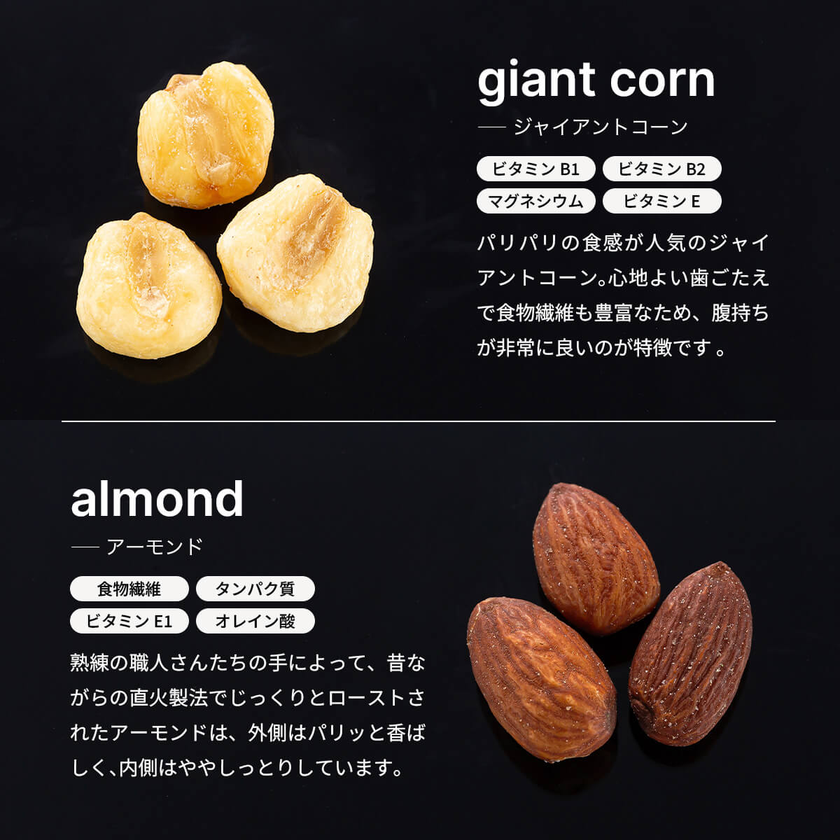 スパイシービアナッツは、ジャイアントコーンやアーモンド、カシューナッツ、くるみなど、厳選したナッツにスパイスをまとわせ、スパイシーに仕上げてあります。