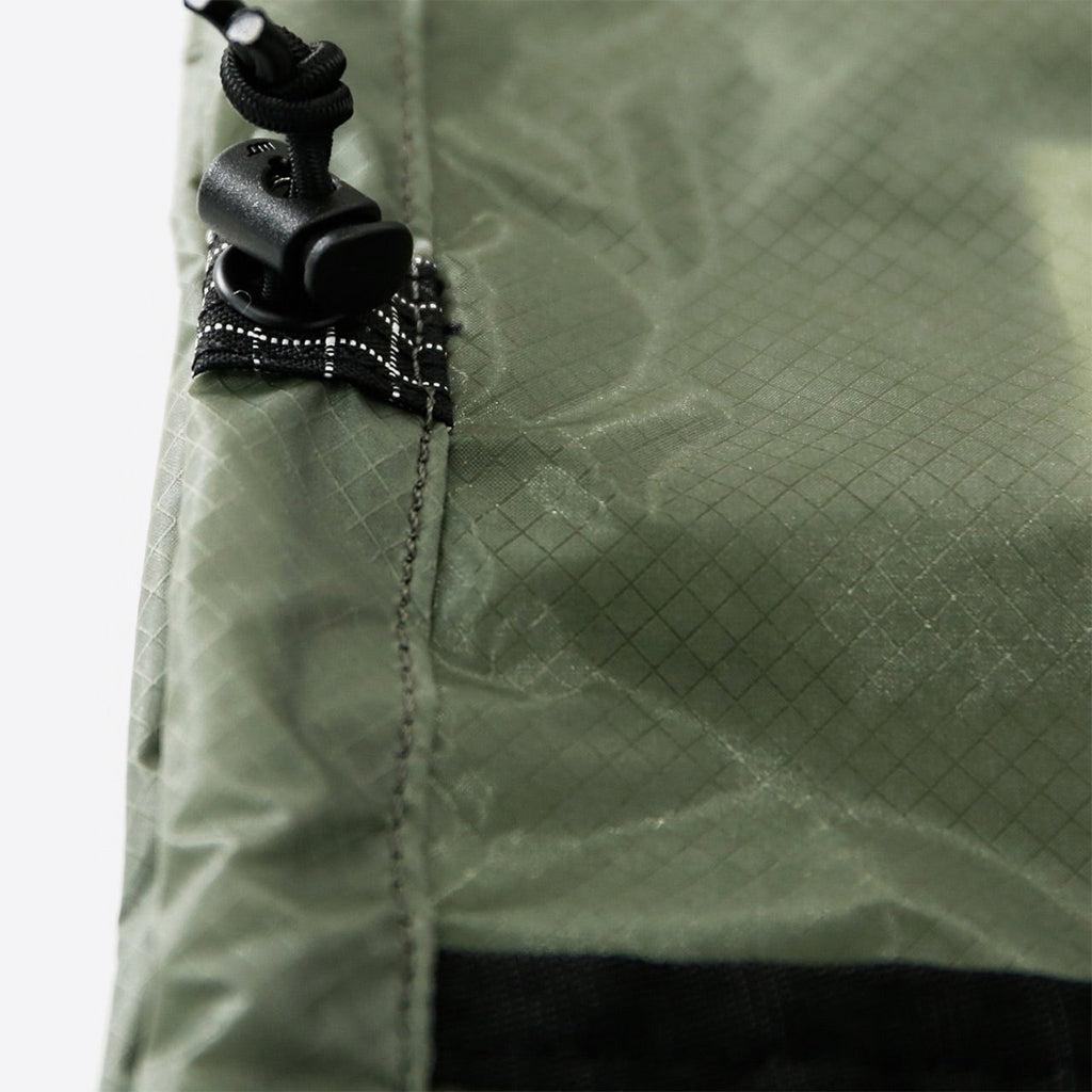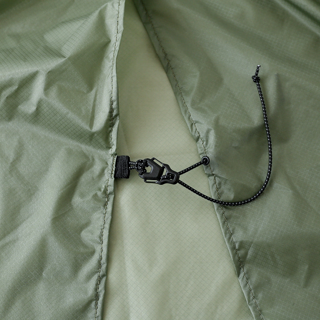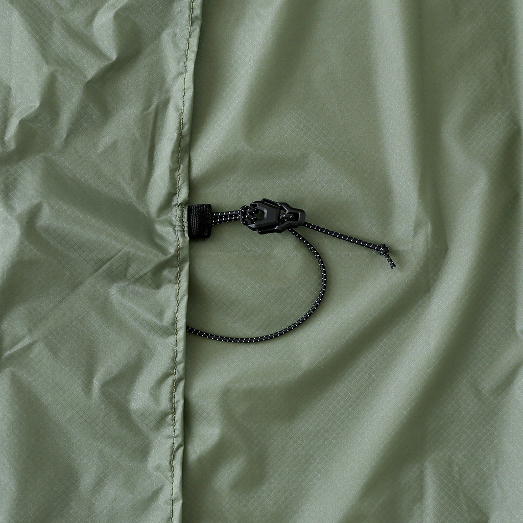 ポンチョとして使う時は、ウエストではなく肩の上あたりでコードを絞れば、上半身やバックパックを雨から防げます。