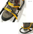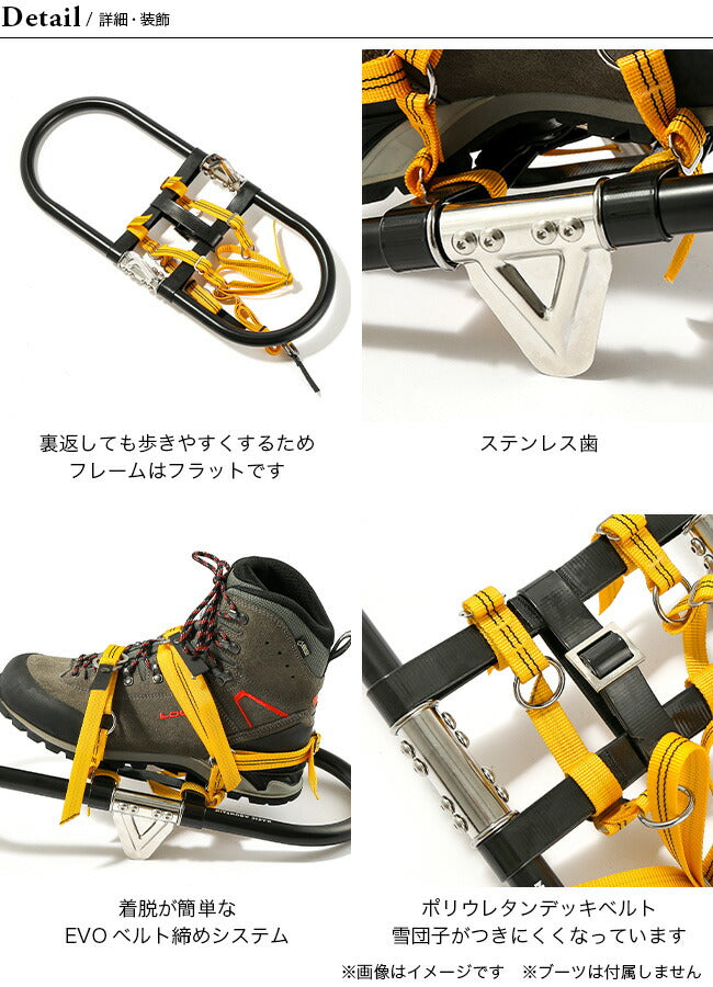 ポリウレタンデッキベルトにより、湿気の多い雪のときに足下でも雪団子がつきにくい。着脱の簡単なEVOベルト締めシステム。