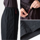 光沢がなく適度なハリコシのあるヴィンテージナイロン素材を採用したこのパンツは秋から春までのシノギングに最適です。使い勝手を考慮してウェストにストレッチドローコードを入れ、腰の両脇に前後に振り分けたポケットを設けていますが、それ以外は柔道パンツそのままの作りで、膝裏には共生地を宛てた補強が施されています。広い股のマチは膝があごに付きそうな急登の動きに難なく追従し、巾広で寸胴な作りによってワイドパンツならではのベンチレーション効果を得ることができます。