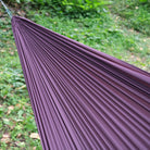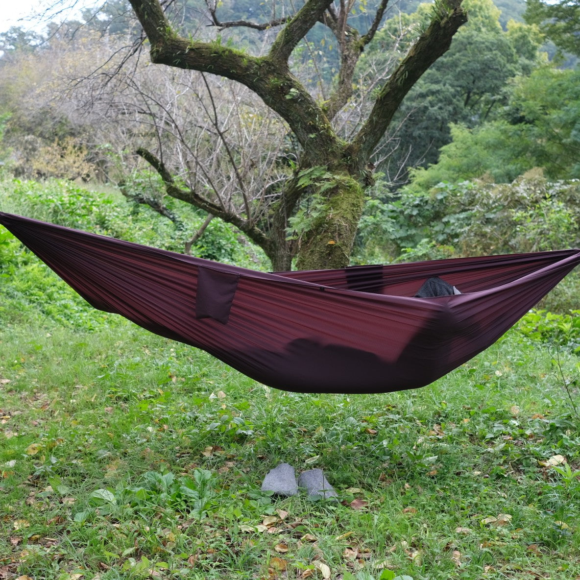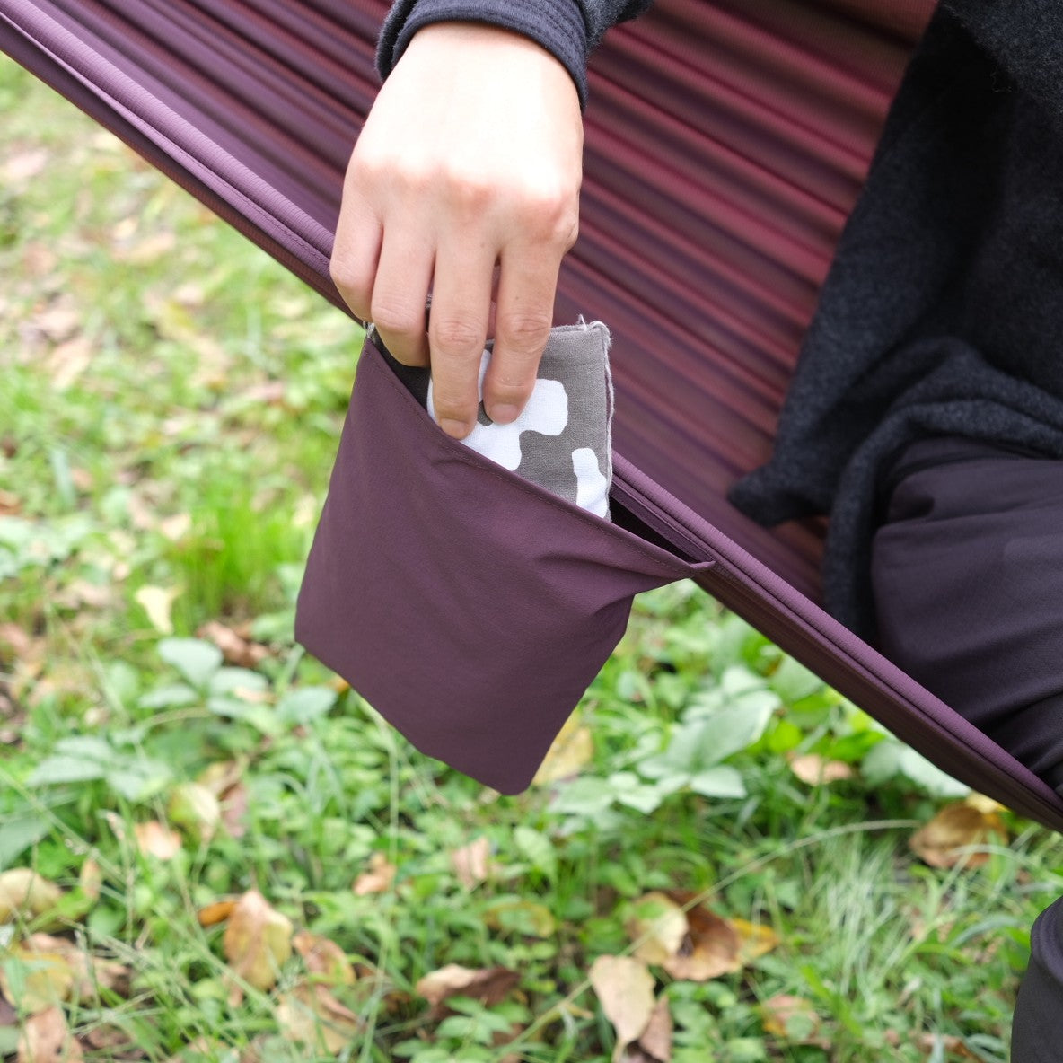 一般にポリエステル素材は伸びが少ないので、それを使用したハンモックは遊びがなく固い寝心地になってしまうことがあります。これに対して少し伸びのあるナイロン素材を使用しているゲッカビジンは、ハンモック面全体でエアサスペンションのような浮遊感を得ることができます。「身体に合わせて伸びてくれる感じ」と言ったらいいでしょうか・・・。そして、一般的なハンモックは体重がかかることで長辺の縁の部分が立ち上がる傾向がありますが、ゲッカビジンにはそれがないのでよりフラットな体勢で寝ることができ、座った時に膝の裏に長辺の縁が食いこむことがありません。そしてこれは生地の伸びによる副産物だと思いますが、座った時に背面が少し立ち上がってちょうどいい背もたれができます。二重織りで細かな凸凹のあるハンモック面は滑りにくく、高い通気性と吸汗性も備えているので蒸れにくくできています。これによって湿気の多い季節や、汗ばんだ状態でベッドインするときの快適性が確保できます。長さ240cm、巾140cm の大きさは、180cmくらいまでの身長の人がゆったり寝ることのできるサイズです。ハンモックの両側に小物ポケットがあるので、どの向きに寝ても座ってもポケットが使えるだけでなく、ポケットの位置を中心からずらしてあるので、アグラスカートやハカマスカートを穿いて使うときにも不便しません。
