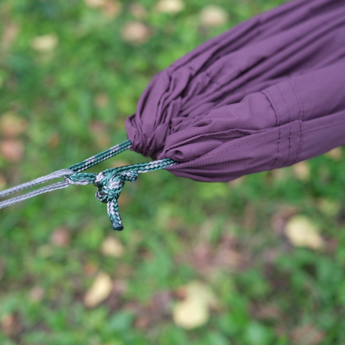 短辺両端のトンネルに通してあるソフトカラビナの結び目が見える状態で使用して下さい。 ソフトカラビナの結び目がトンネル内にある状態で使用するとハンモックに損傷を与えます。
