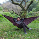 体重をかけるとハンモックが沈み込むので、その分少し高めに張るのがポイントです。凌の美学に基づいて月下美人には収納袋が付属しません。それは、タープやハンモックなどの大きな布ものはパッキングの最後にバックパックの隙間に十分収まるからです。こうすることでバックパック本来のかたちをきれいに出すことができ、荷重バランスもとりやすくなります。