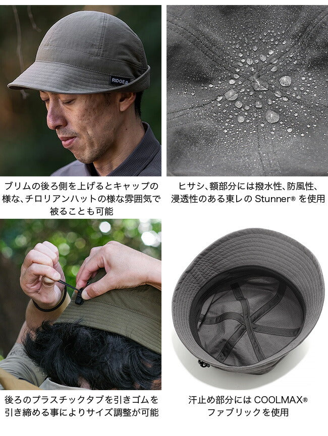 ハットの本体部分には撥水性、防風性、浸透性のあるナイロン100%素材、東レのStunner®を使用しています。