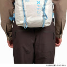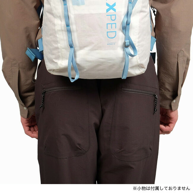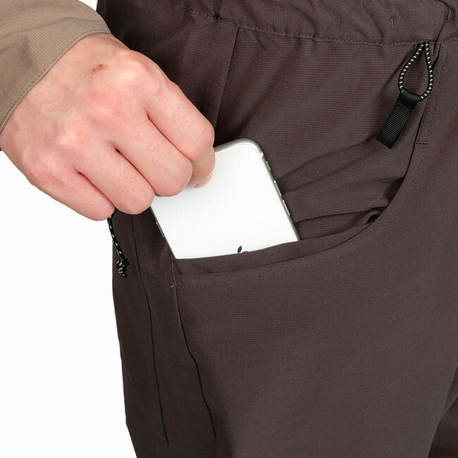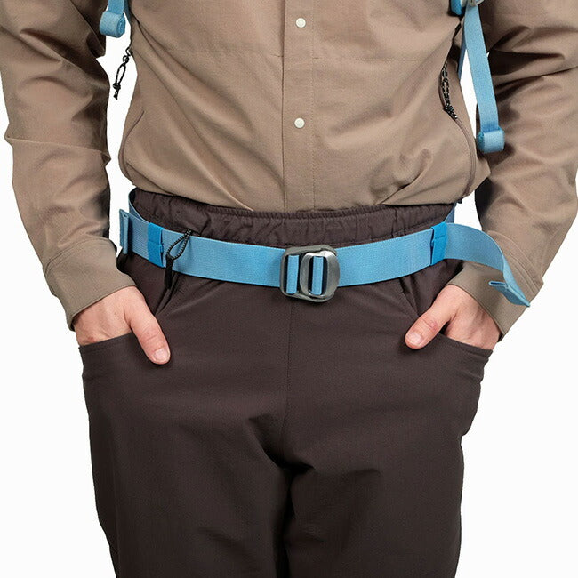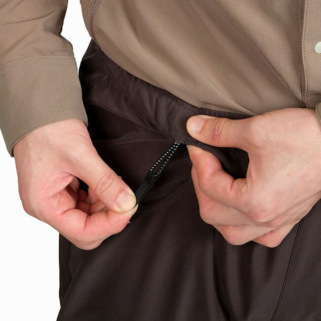 ベルトレスの腰周りはバックパックのヒップベルトと干渉せず、ポケットの位置も低めで使いやすい設計です。