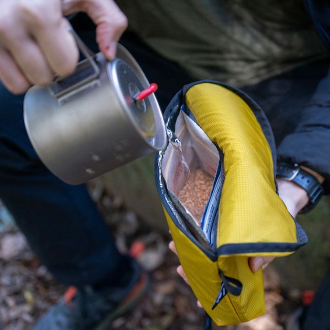 PCTを歩く中で自作したフードコジー(保温カバー)を使用し、保温調理で燃料消費を大幅に削減しました。