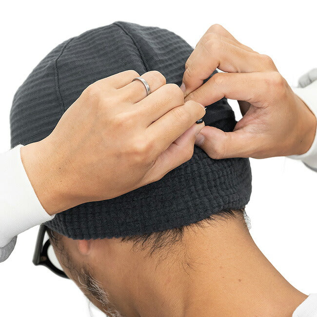 ヘッドサイズ(頭囲)は一般的なキャップに比べ多少ゆったり目になっていて、後ろのプラスチックタブを引きゴムを引き締める事によりサイズ調整が可能です。