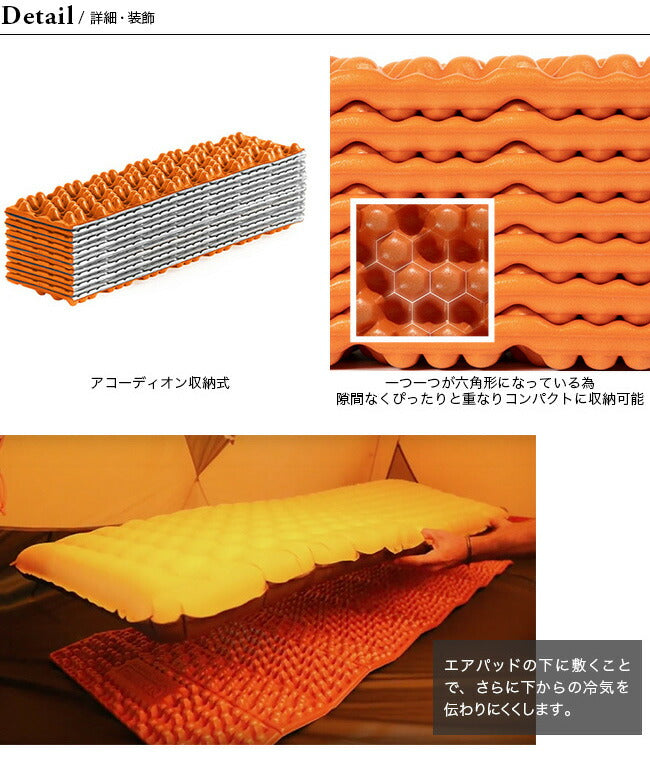 ヘキサゴナル(六角形)シェイプをベースとした独自のデザインと、硬さの異なる2層のフォーム素材を組み合わせることで、同カテゴリーの一般的なパッドよりもはるかに快適な寝心地を提供しながらも、コンパクトに収納できます。