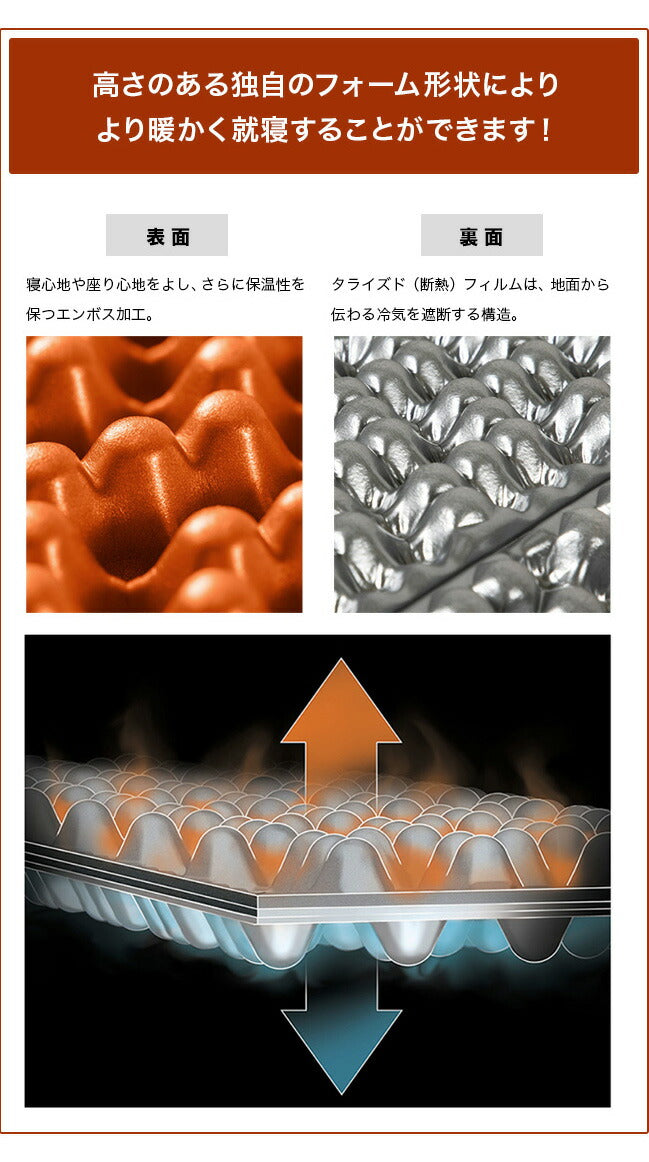 裏面には熱を反射するサーマルフィルムを装備、高さのある独自のフォーム形状により、同カテゴリーの一般的なパッドよりも、20%も圧縮されない(空気を溜め込むことができる)スペースを確保し、より暖かく就寝することができます。