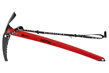 ネパールSAはピックやアッズのエッジをやや取ってあるが、丈夫な熱間鍛造ニッケルクロムモリブデン鋼製のヘッドで締まった雪でもしっかりと効き、取り回しの良さを考慮した造りになっています。緩くカーブしたS.A.(self-arrest)シャフトは滑落停止の動作を行い易くするための形状で、テクニカル要素の無い一般的な雪山に好適なアックスです。