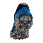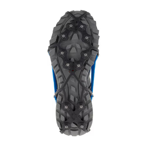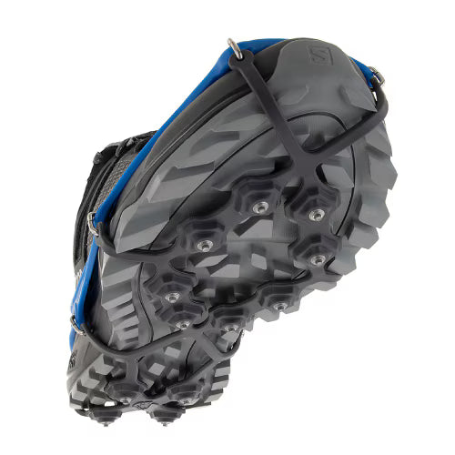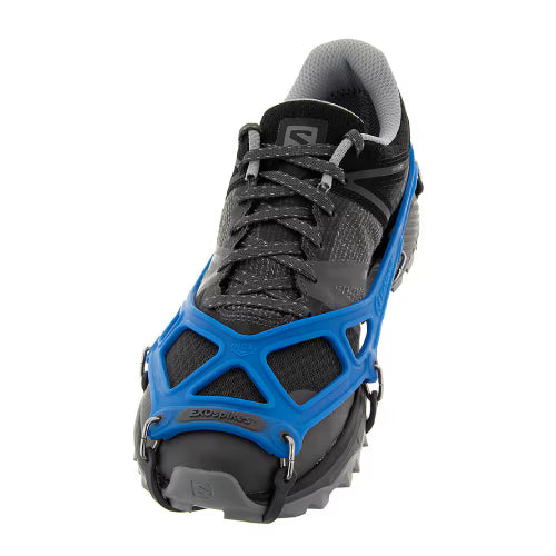 EXOspikesは冬期のトレイルランニングやハイキング向けに開発されたモデルです。氷や雪、土など様々なフィールドが発生する冬の低山で、12本のスパイクが優れたグリップ力を発揮します。足裏全体に効果的に配置された12本のスパイクにより、雪上でも快適に歩くことができます。柔軟性に優れたバンド仕様で、シューズの形状に合わせて伸ばして引っ掛けるだけで簡単に装着できるため、初心者の方にもおすすめです。