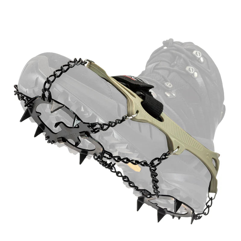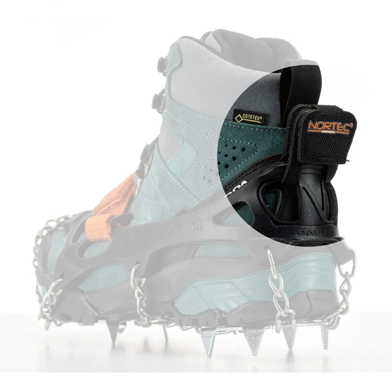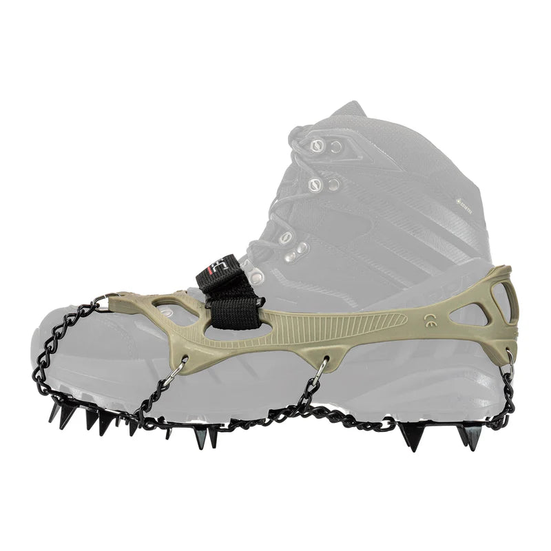 - 伸縮性ベルクロバンドが付属し、シューズの甲に設置することでクランポンのズレを防ぎます。