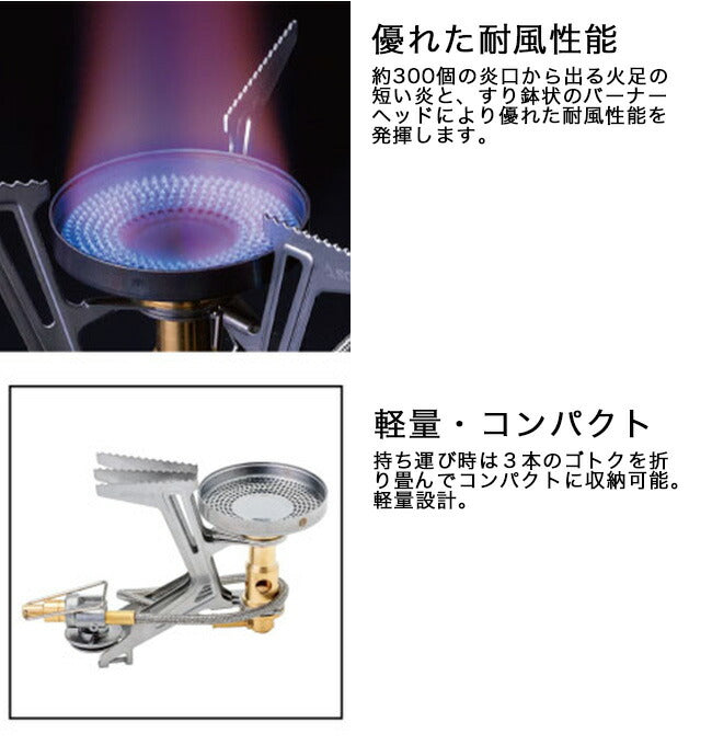 風に強いすり鉢状の火口や不整地の地面をしっかり捉える3本ゴトクなど、登山、トレッキング用としてアップグレードしたストーブです。