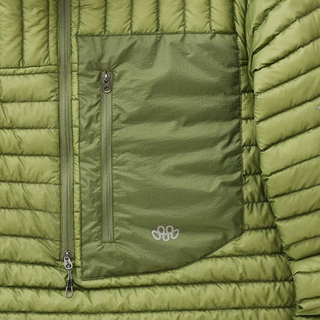 左胸の大きめのチェストポケットに収納できるパッカブル仕様。パッキングしやすいサイズ感で、二つ折りにもできる。