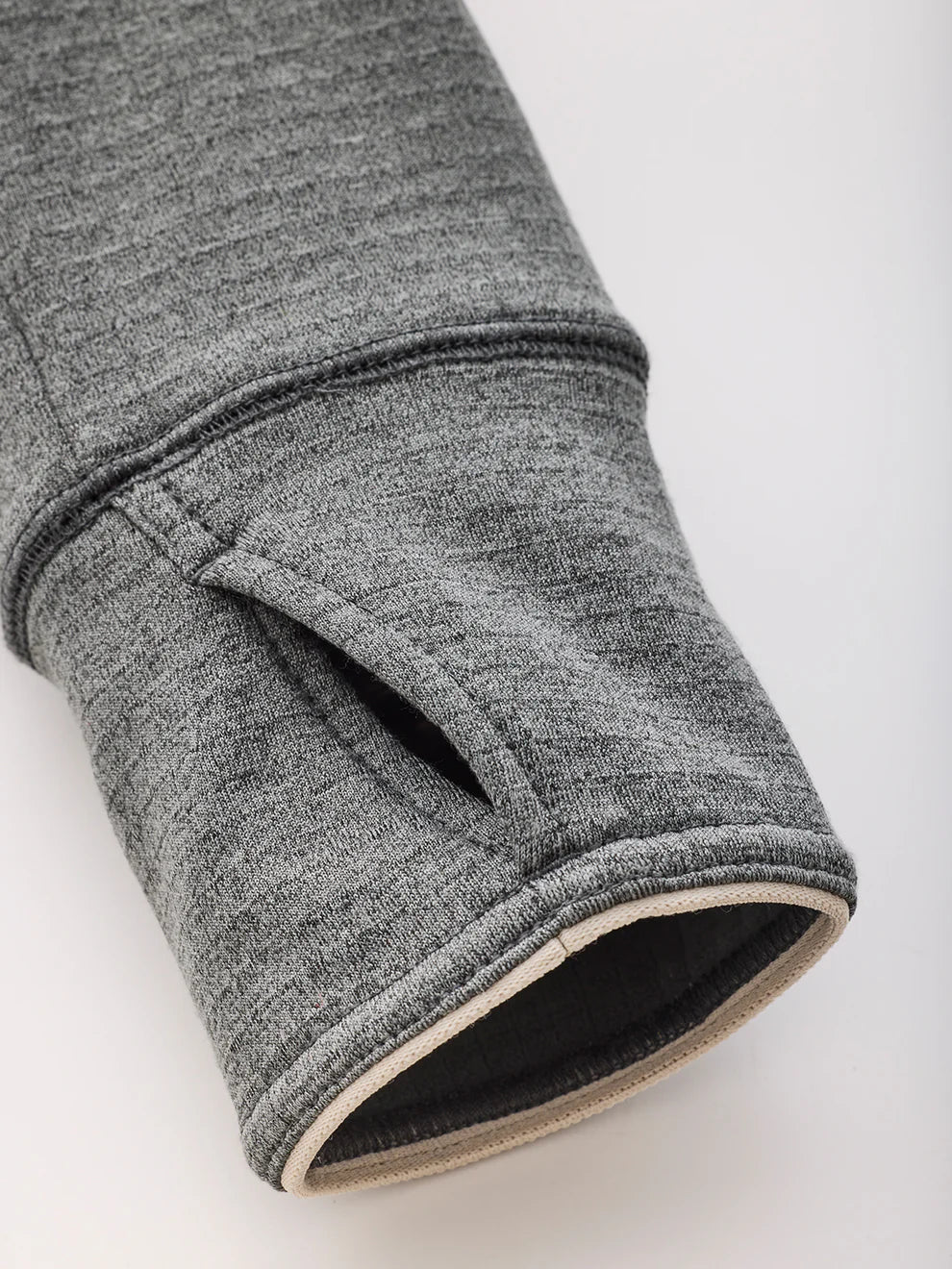 「Octa」とウールを理想的に融合させた「Octa Wool High Loft」を使い、ふわりとした優しい着心地で人気のシリーズ。羽毛のように毛羽立たせたフェザーヤーンを使い、ボーダー状に編み込んでいるのが特徴です。「Octa」の軽さ、保温性、通気性、速乾性と、ウールの調湿性、防臭性などの機能に加え、従来のハイロフトフリースにはない伸びやかなストレッチ性も兼ね備えています。テックフーディは、フィールドでの使い勝手を重視してデザイン。バックパックと擦れる肩から胸はナイロン生地で補強。擦れやすい脇と肘から下には、「Graphene Grid Fleece」をマッピングして強度とフィット感を高めています。