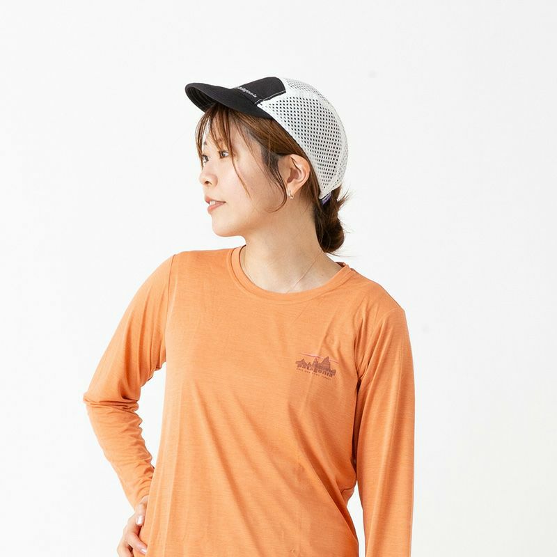 フロントパネルとつばは、漁網をリサイクルして海洋プラスチック汚染の削減に貢献する、ネットプラス・ポストコンシューマーリサイクル・ナイロン100%素材のファイユを使用。水分を弾くDWR(耐久性撥水)加工はPFASを意図的に使用せずに製造。頭頂部とバックパネルは熱を発散して通気性を高めるリサイクル・ポリエステル100%のメッシュ