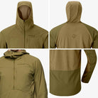 コアエリアに高い保温性、耐風性、通気性を備えるハイブリッドミドルレイヤーです。