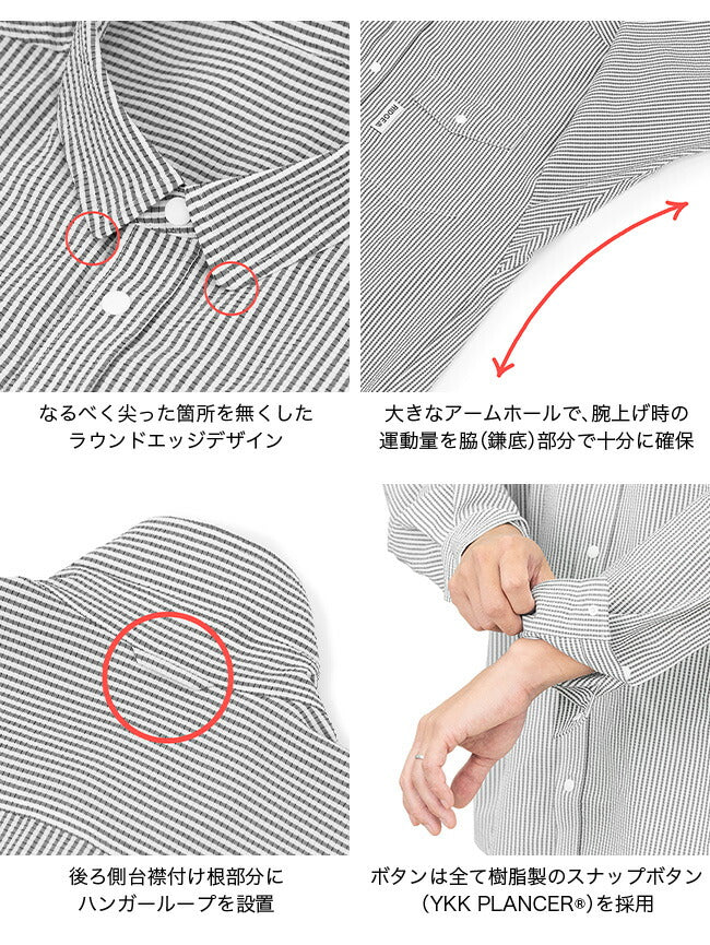 この製品には4Wayストレッチ(縦、横方向にストレッチ)の「Primeflex®×Dot Air®2Way サッカーストライプ」を使用しており、空気の流れを助けて肌から離れた状態を保つことで、涼しい着心地を実現します。