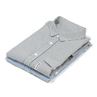 このシャツの衿は「台衿付きシャツカラー」を採用しており、台衿がついていることで、衿が首に綺麗に沿い、小さめにデザインした上衿は風によるバタつきを最小限に抑えます。